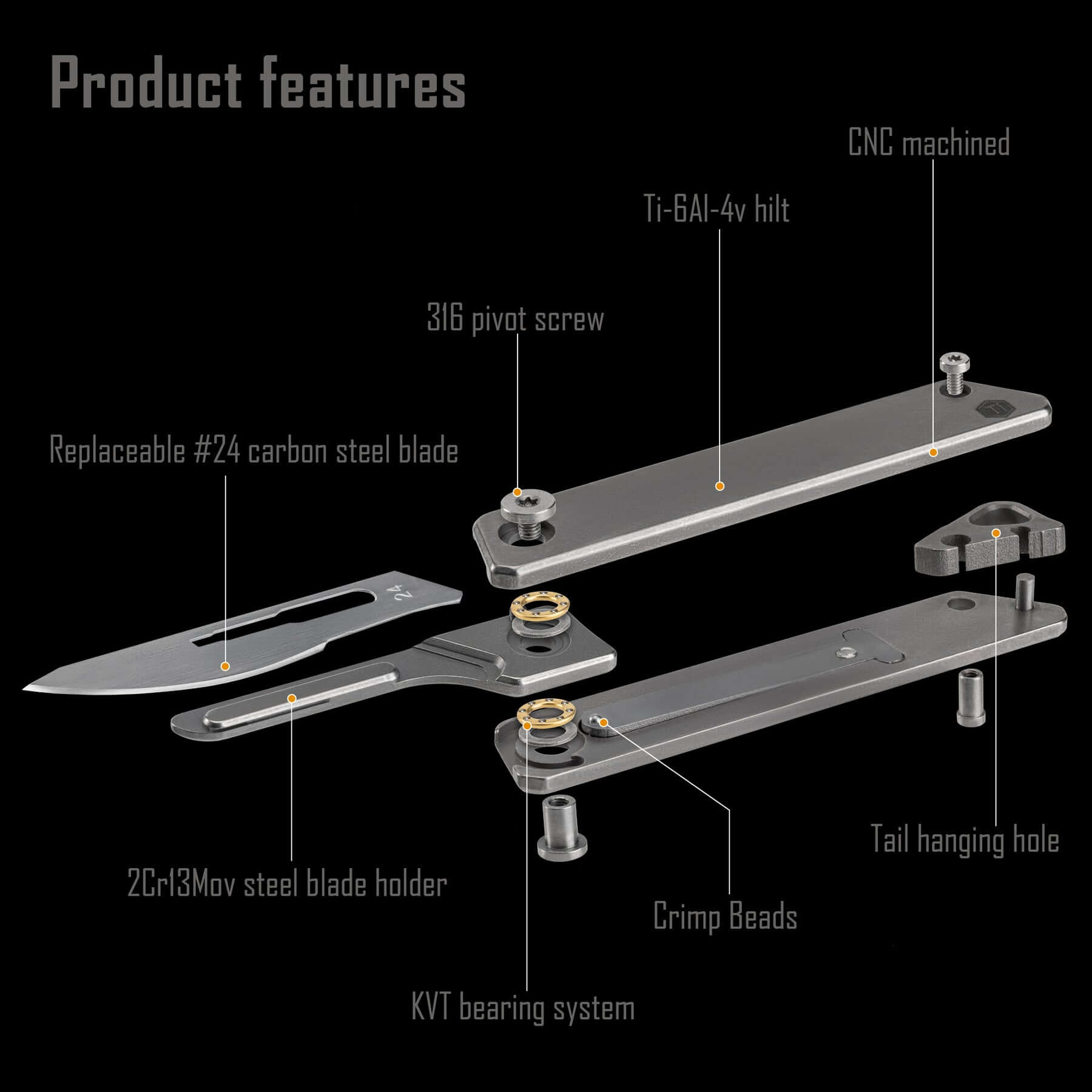 1.Variety of materials. The handle is made of Ti-6Al-4v titanium alloy. The blade holder is made of 2Cr13Mov steel with thickness of 2.5mm. The ridge adopts with 3mm 2Cr13Mov steel wire. The blade is replaceable #24 carbon steel, while the screw on the spindle is 316 stainless steel.